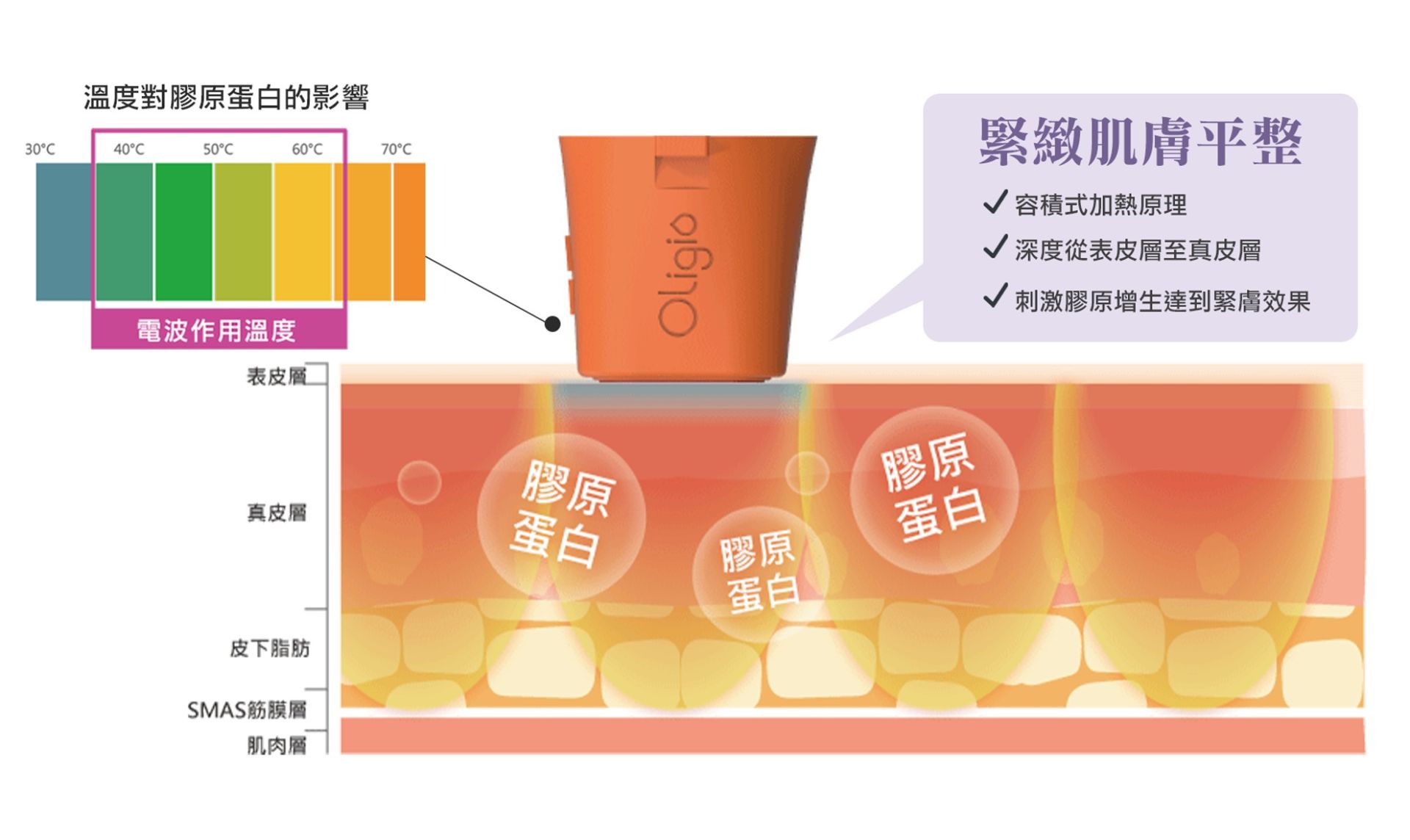 第一重效果:透用3D單極射頻,使加熱輸出能量(40-60°C)由內而外從表皮傳導至筋膜層,利用高溫刺激膠原蛋白增生,因熱效應立即進行收縮,以達到緊緻拉提的效果。