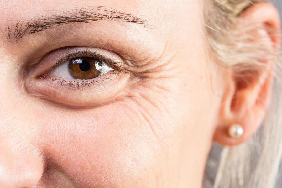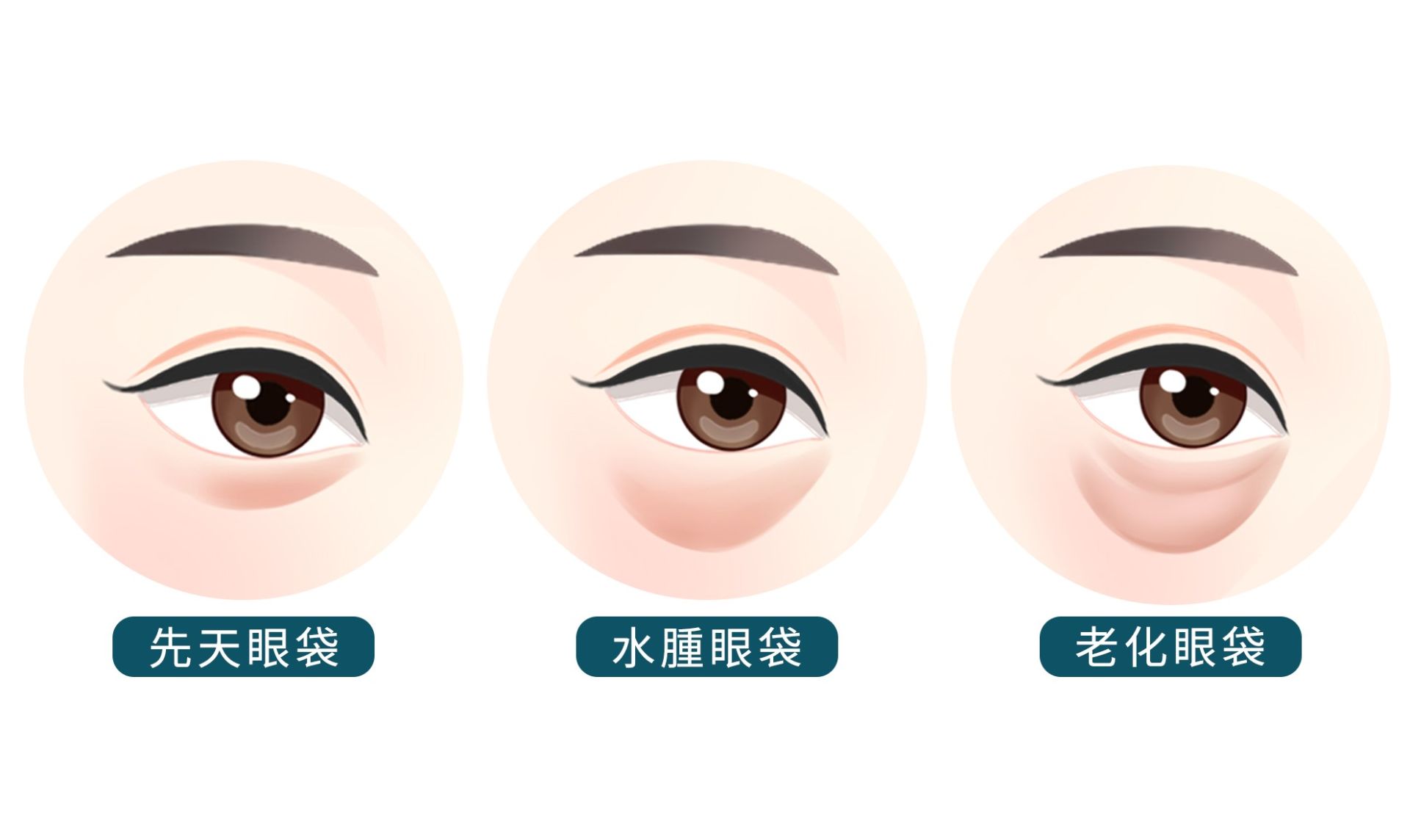 老化型眼袋:年齡增長導致眼輪匝肌鬆弛、脂肪膨出、皮膚失去彈性,眼睛周圍的膠原蛋白流失、眼眶空間變大,形成多層皺褶或眼袋下垂。常伴隨淚溝凹陷、眼周陰影感。
