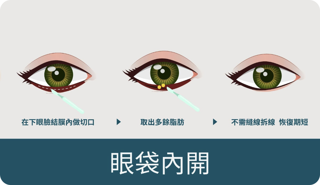 在下眼瞼內側切出小切口,撥開筋膜層後,將多餘的脂肪分離去除,術後傷口小恢復快、不須縫合拆線、無外部疤痕。