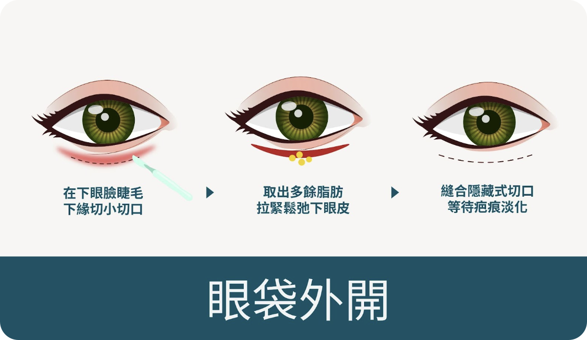 沿著下眼瞼睫毛下緣切小切口,依序分離眼輪匝肌、下眼眶中隔,將多餘的脂肪和鬆弛的肌膚去除後縫合,疤痕可隱藏於自然皺摺處。