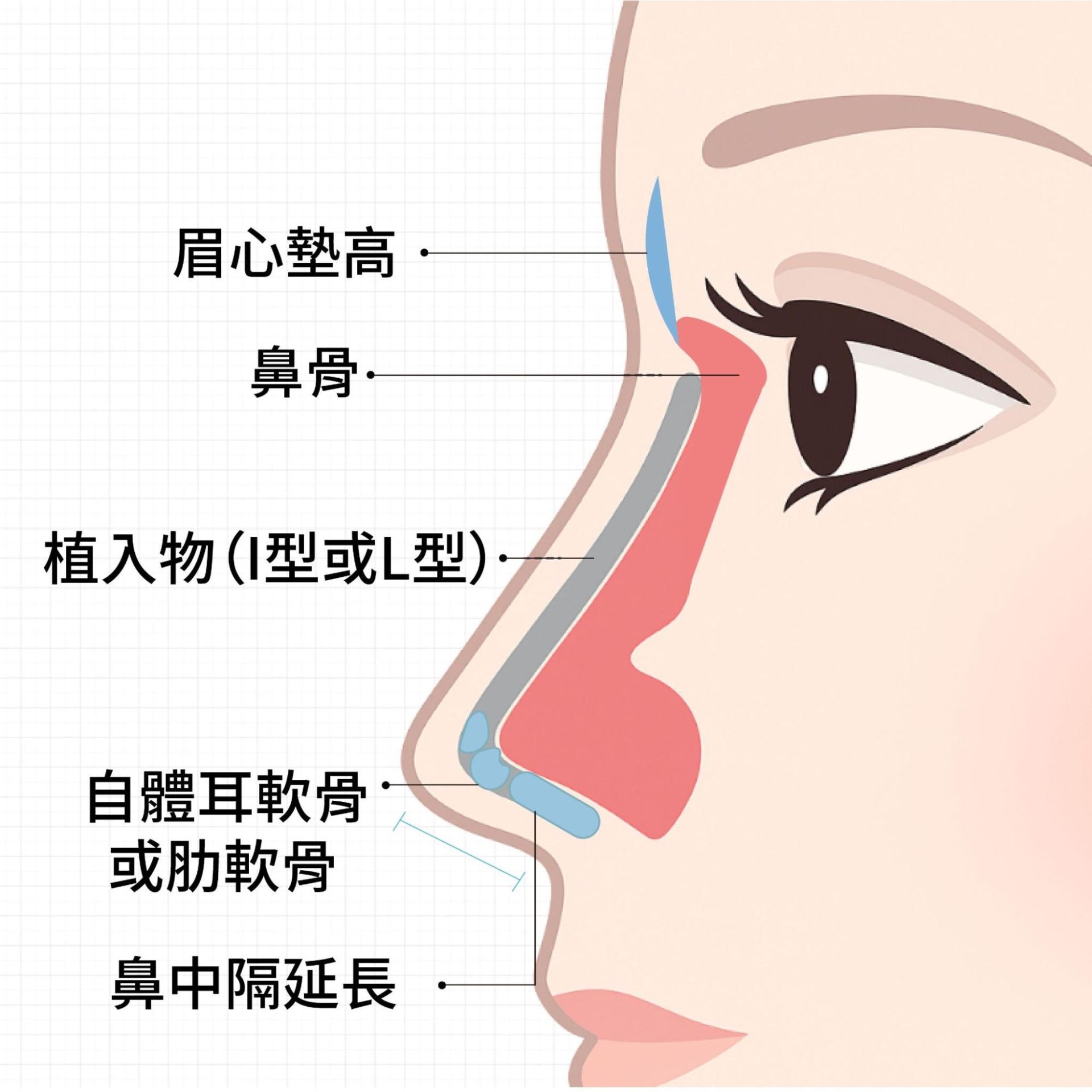 三段式結構隆鼻將 I 型或 L 型鼻模「切割分段」置入做高度,再取自體耳軟骨或肋軟骨墊出鼻尖弧度;可同時處理山根、鼻樑、鼻尖、眉心墊高或鼻中膈延長,全客製化結構調整,能改善各種鼻型問題。